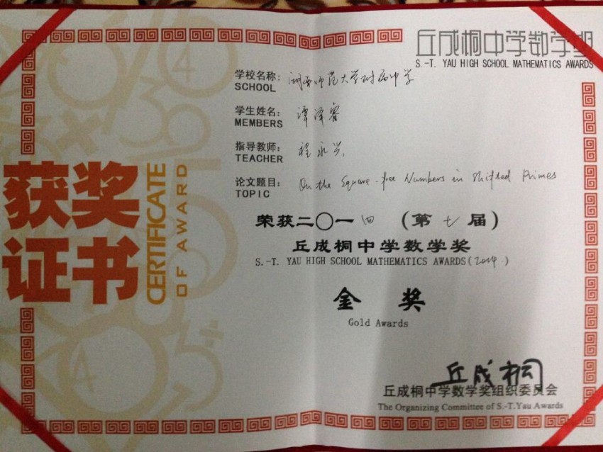 喜报:湖南师大附中国际部谭泽睿同学荣获“丘成桐中学数学奖”全球唯一金奖