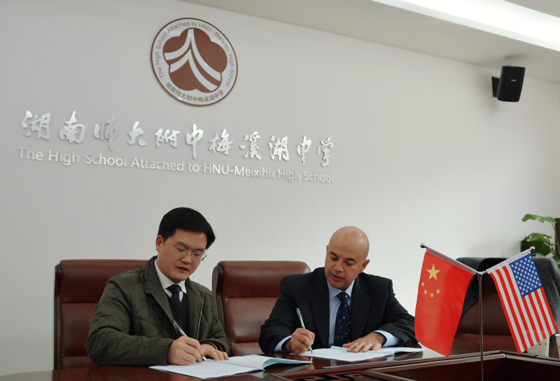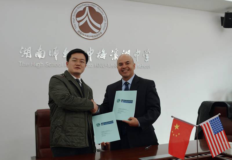 我校校长彭荣宏与美国华盛顿中学校长Mario Carlos签订两校友好合作协议,标志着我校和美国华盛顿中学正式结为姊妹学校。