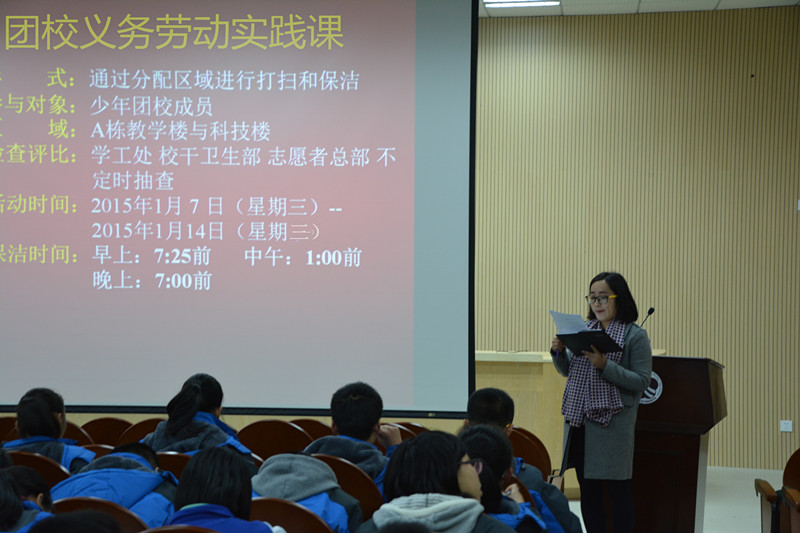 学校开展义务劳动实践课 来源:学工处 张娟 发布时间:2015-01-22 00:00:00 浏览次数: 次 【字体:小 大】 1月8日,少年校团在教学楼三楼阶梯教室开展了义务劳动实践课。少队辅导员兼教职工团支部书记罗煦洁主持活动。学工处张娟老师担任主讲嘉宾。 张娟围绕社会主义核心价值观,介绍了本次实践课的主要内容,并对团校学员作出了具体的要求。课后,张娟还带领团校学员熟悉了各自负责的卫生区域,并强调了相关注意事项。 本次课程由校团委和学工处共同举办,取得了良好的效果。 分享到: 【打印正文】