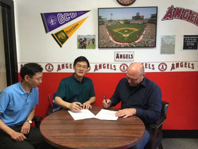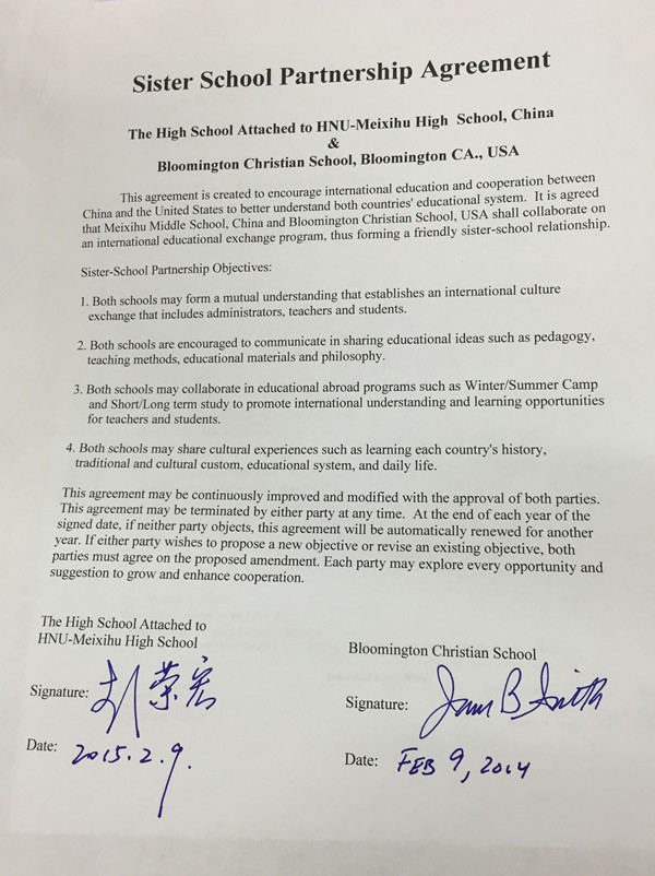 随后,双方举行了签约仪式,彭荣宏与Jim Smith签订两校友好合作协议,标志着我校和美国洛杉矶布卢明顿基督教中学正式结为姊妹学校。