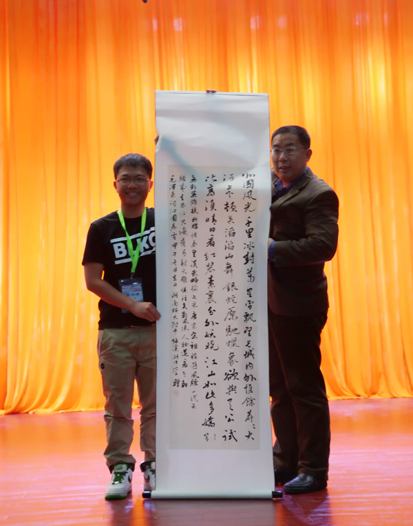 10时许,工会副主席谭伟在体艺馆三楼礼堂主持了隆重的欢迎仪式。副校长莫晖代表学校对客人的到来表示热烈的欢迎,并向这6所学校一一赠送了由我校青年教师、“教育因你而美”全国书画赛大奖获得者贺娟老师撰写的书法作品。