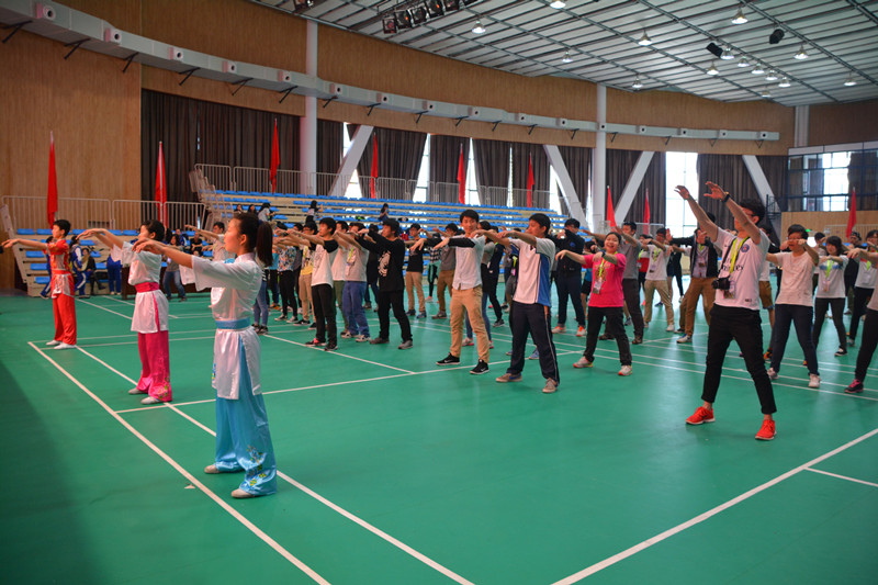 随着一阵激扬的音乐响起,我校健美操队和武术队师生先后闪亮登场,展示校本课程建设成果。健美操队员动作整齐,激情四射,绽放出靓丽的青春风采。武术队师生拳掌刀剑,样样娴熟,宛如一位位“武林高手”。