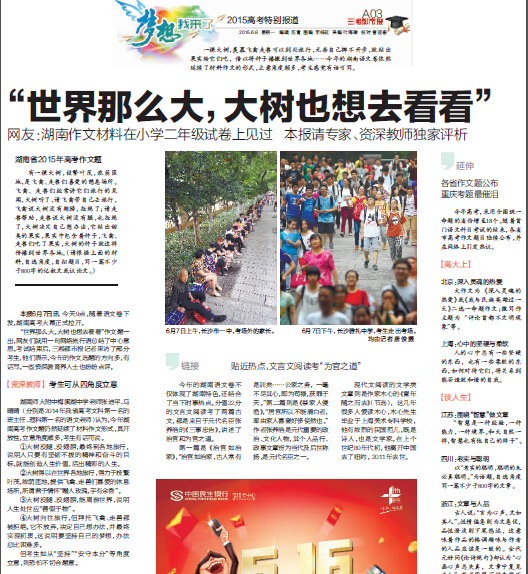 6月7日上午,随着语文卷下发,湖南高考大幕正式拉开。 考试结束后,三湘都市报特邀一些资深教育界人士点评今年的高考作文题。我校语文组张迪平、马晴晴老师作为资深教师代表,受邀对作文题进行了点评。现转发如下: