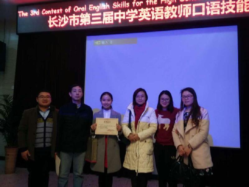 12月9日,长沙市第三届中学英语教师口语技能大赛在长郡雨花外国语学校举行。我校英语组教师王珏凭借沉稳大气而优雅出彩的表现荣获特等奖,并直接晋级CCTV全国希望之星教师风采大赛。