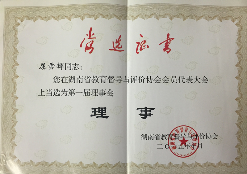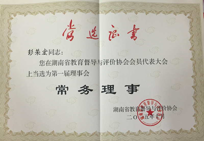 喜报:校长彭荣宏当选省教育督导与评价协会常务理事 来源:校办 发布时间:2015-12-17 11:27:59 浏览次数: 次 【字体:小 大】 近日,喜讯传来,在湖南省教育督导与评价协会会员代表大会上,我校校长彭荣宏当选第一届理事会常务理事,校长助理屈雪辉、督导室主任胡平新当选第一届理事会理事。 分享到: 【打印正文】