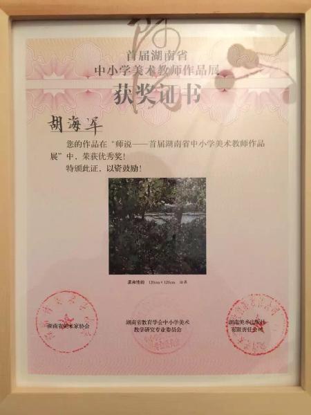 艺术教研组组长胡海军的油画作品《潇湘情韵》获优秀奖(最高奖),唐高丽老师的油画作品《溢·系列二十》入选。两位教师的作品都得到在场专家们的一致好评。两位教师作品艺术风格独具个性,画面大胆新颖,油画气氛浓烈,作品抒情、浪漫、写意,在表现技法方面也体现出专业画家的手段与技巧,充分展示了我校美术教师的艺术创作水平。