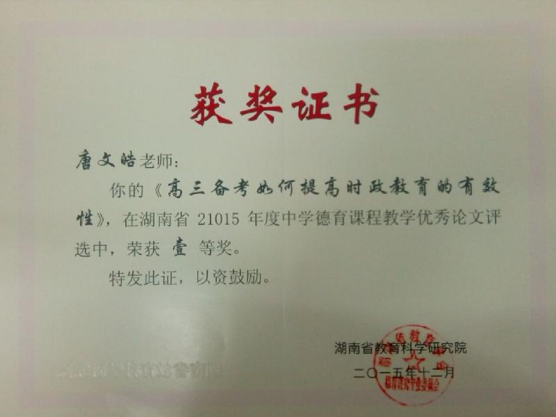 喜报:我校教师在省级优秀论文和微课评比中荣获佳绩 来源:政治 发布时间:2016-04-07 23:37:17 浏览次数: 次 【字体:小 大】 近日,喜讯传来,我校政治教研组唐文皓老师的论文《高三备考如何提高时政教育的有效性》在湖南省2015年度中学德育课程教学优秀论文评选中荣获一等奖,郎海燕老师的微课《家庭结构类型》在2015年湖南省基础教育微课大赛中荣获二等奖,教学教研取得成效,特向全校师生报喜! 分享到: 【打印正文】