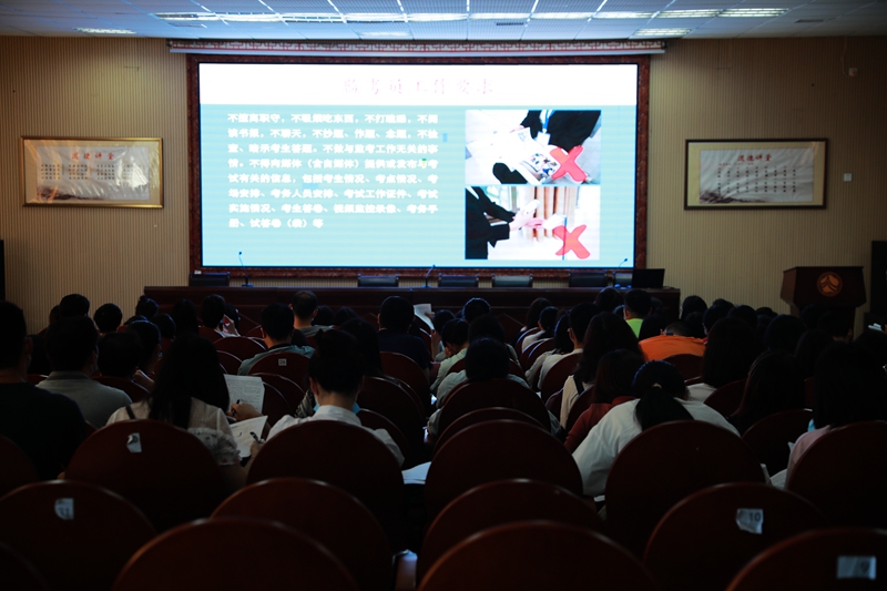 会上,张迪平代表学校对外校监考教师的到来表示欢迎,对全体考务人员表示感谢。张迪平指出,2021年是庆祝中国共产党建党100周年、省市县换届选举之年、湖南省首届新高考落地之年,也是疫情防控之年,2021年高考组考工作备受关注。他强调为国选才,使命光荣,全体考务人员要提高政治站位,高度重视,要求大家规范操作,认真学习并严格落实考务培训内容,希望大家做到零事故、零差错、零投诉,再创优秀考点。教务处副主任兼工会副主席王光裕就考务具体工作做了相关培训。他详细介绍了本次考试的时间、科目、考点概况、组考要求、开考前工作程序、开考后工作程序、考试结束工作程序,重点讲解了“三铃四哨”的工作细节,以及偶发事件处理办法、常见问题和注意事项。他希望全体考务人员提高站位、压实责任,严格管理、规范操作,细心工作、暖心服务,实现“保平安,保质量,保公平”和“零事故、零差错、零投诉”的工作目标。