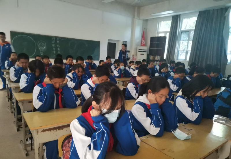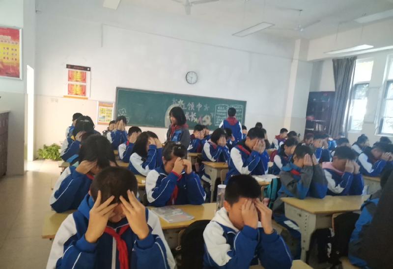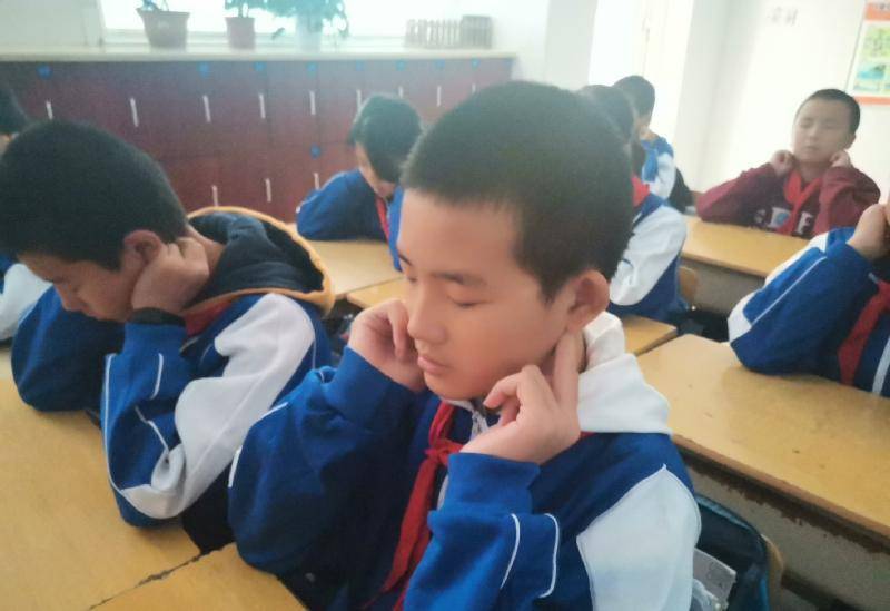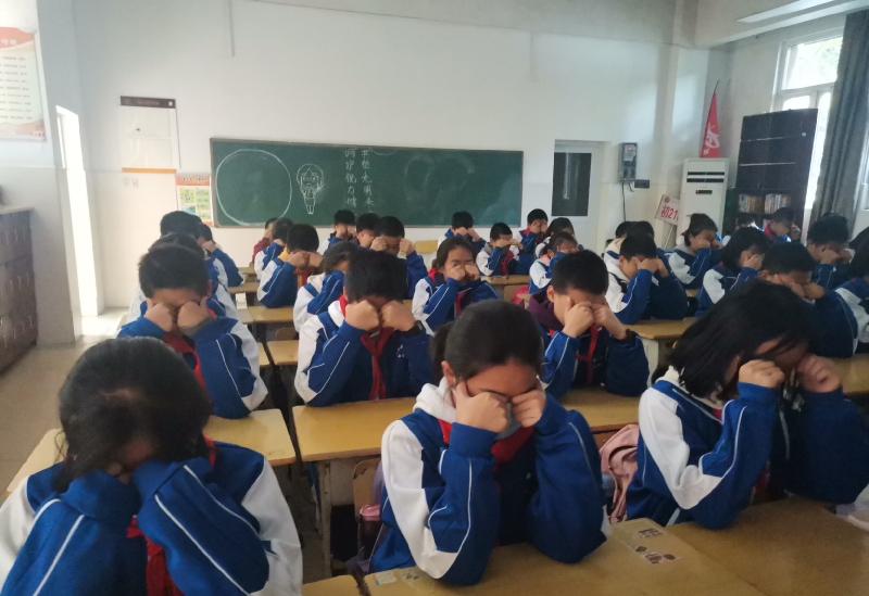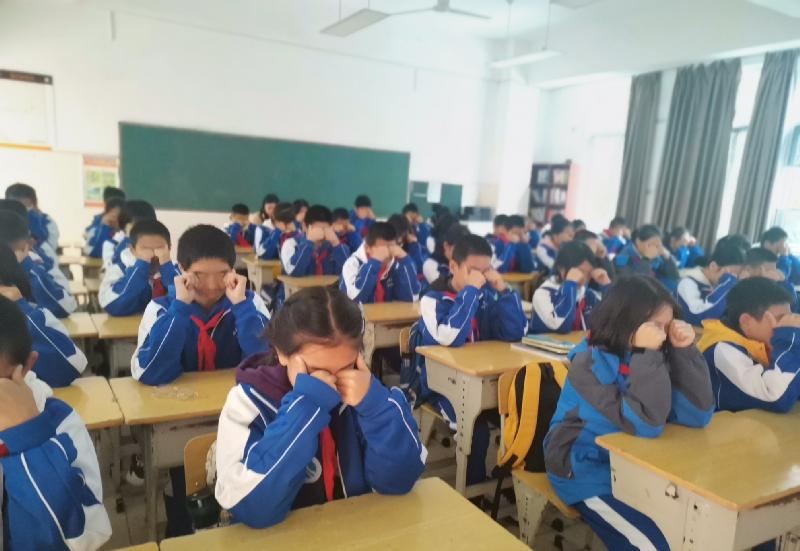 学生处干事、医务室校医、校学生会组成的5人评委组逐一检查每个班级,从全员参与、准备工作、精神面貌、穴位准确、动作规范、环境及个人卫生和纪律等七个方面进行评分。“轻闭双眼,身体坐正……”伴随着轻柔、舒缓的眼保健操音乐响起,学生们个个精神抖擞,端坐在自己的座位跟着节奏认真地按揉穴位,动作整齐一致。在巡查过程中,评委老师们还对按揉穴位不够准确的孩子进行耐心指导。