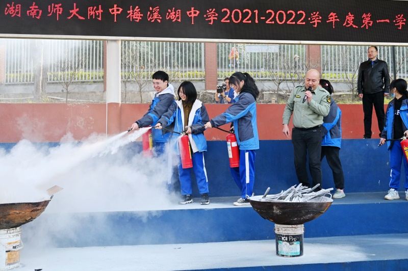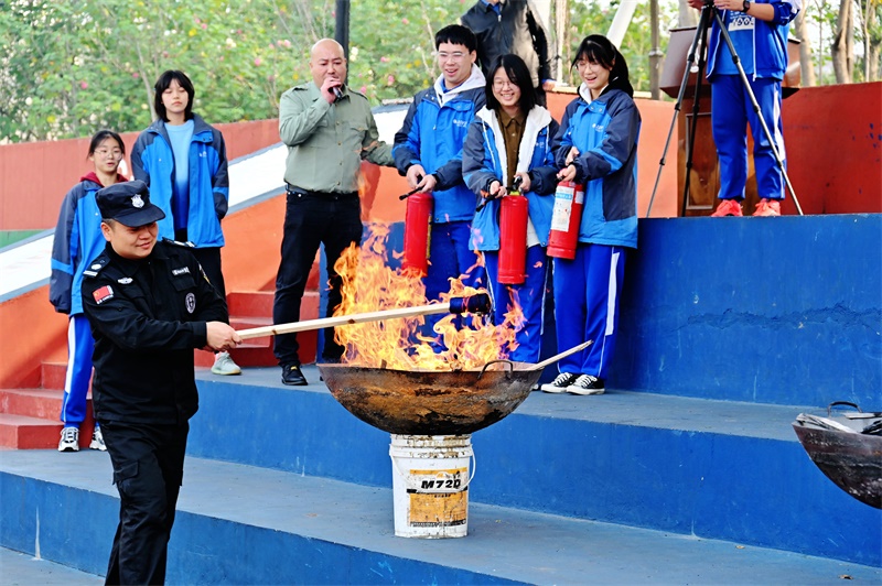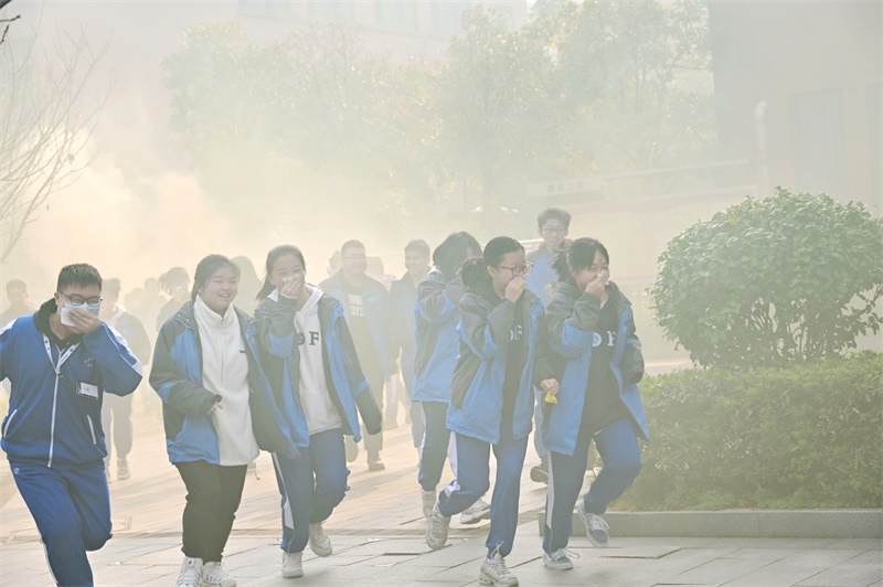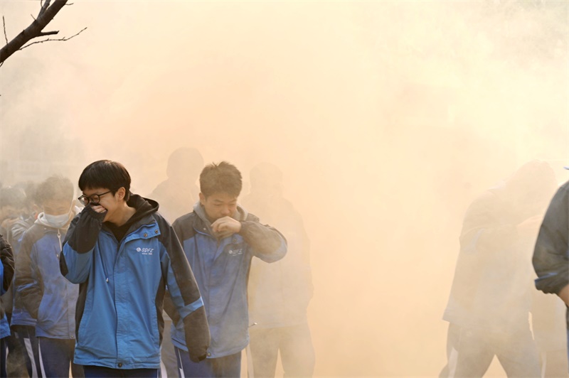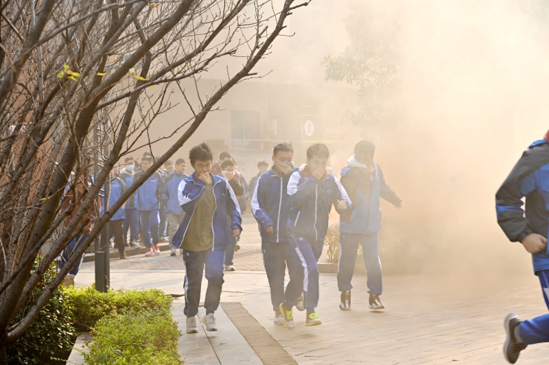 上午9点30分,警报拉响,各班学生按照预定方案,在各班主任、各岗位工作人员的引导下,低头躬身快步行进,迅速有序地撤离至指定地点。各班清点并汇报完人数后,袁教官为师生们讲解了消防安全知识,并示范了如何正确使用灭火器。学生代表根据灭火技术要领,有条不紊地完成了灭火实操演练。