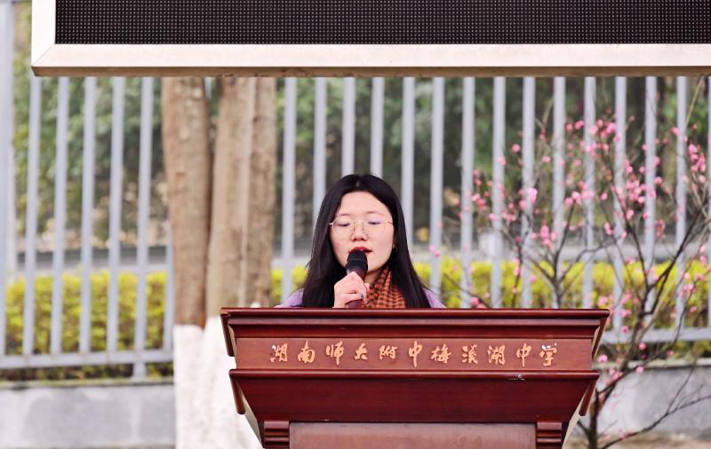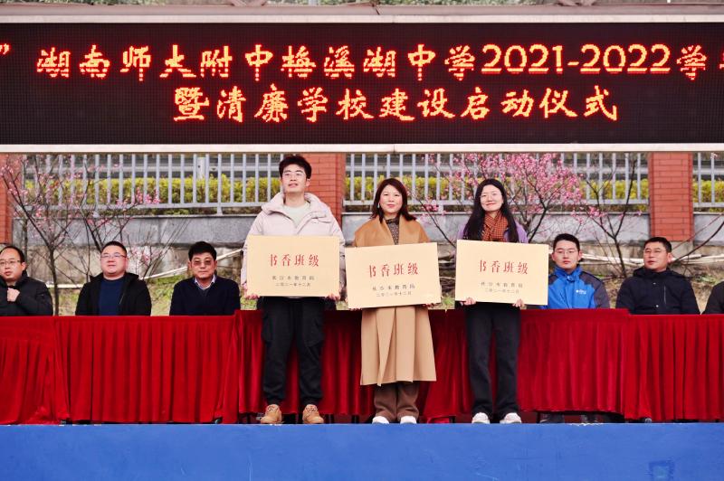 接着,进行颁奖仪式。在2021年长沙市“书香班级、书香少年”评比中,我校初2104班、初2106班、高2106班荣获长沙市“书香班级”荣誉称号,张迪平校长为获得荣誉称号的班级进行颁奖。获奖班级代表初2104班班主任胡文茜老师发言。她和同学们分享古代“三余”“三上”的故事,并介绍了班级坚持“余时多读书,不枉师梅人”的理念,以及开展的一系列丰富多彩的读书活动。她和同学们一起约定:从新学期起,从现在起,从一本好书起,每天阅读,共同营造师梅浓厚的学习氛围,诠释师梅人爱读书的优良校风。