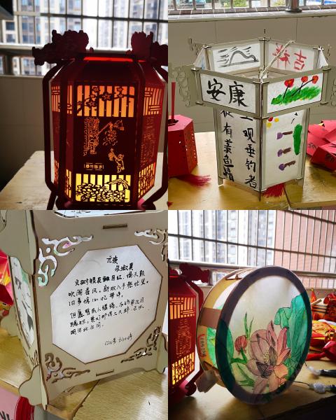 年级学生各展才华,充分发挥自己的想象力与创造力,使用画笔、颜料、剪纸、粘贴等多种方式制作,从设计、剪裁再到拼装,精心完成,呈现了具有节日氛围的精美花灯。花灯上或缀有流苏,或敷以剪纸,或附以诗词;或四棱台,或八棱柱,或古典,或现代,或动物,或花鸟,样式繁多,美不胜收。在学生们的巧手下,一盏盏匠心独具、造型各异、妙趣横生的花灯,象征着团圆和美好。花灯让浓浓的中国风、中国情环绕在师梅校园,形成了一道靓丽的风景线。