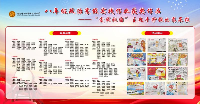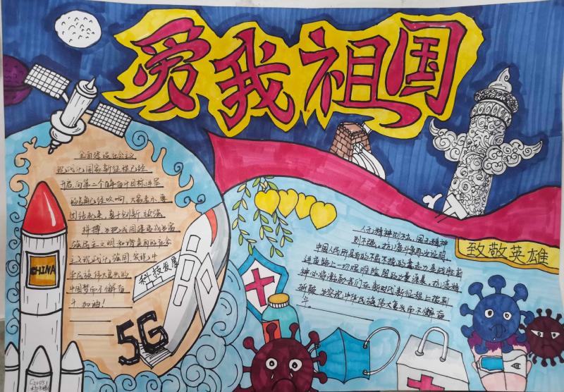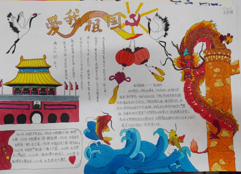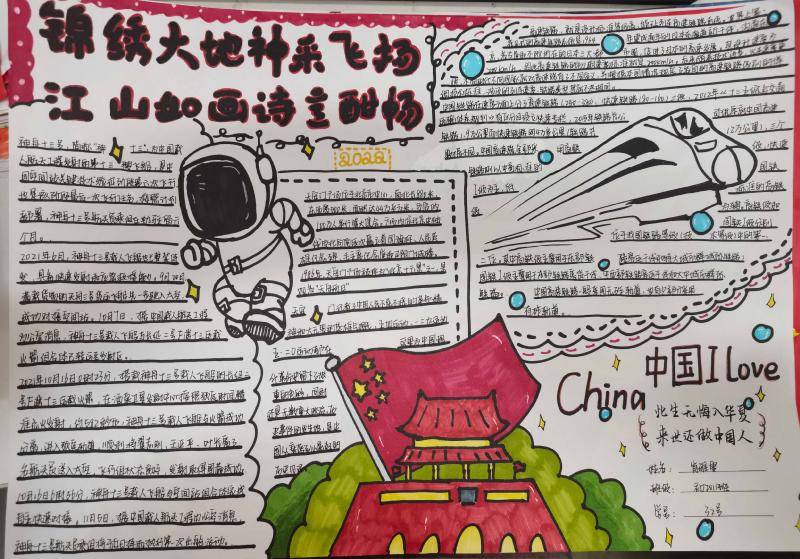 八年级各班高度重视此项工作,班主任积极对手抄报制作进行指导。活动中,同学们踊跃参与,饱含热情,认真搜集资料,以爱我祖国为主题精心构思,从我国优秀传统文化、中华民族精神、冬奥会和近年来取得的重大科技成就等不同角度进行设计,充分发挥自己的聪明才智,绘制出一幅幅图文并茂、感情浓烈的优秀作品。作品各具特色、主题鲜明、构思精巧、色彩清丽,较好地实现了思想性和艺术性的统一,充分锻炼了学生排版、书写、美工等多方面的能力。