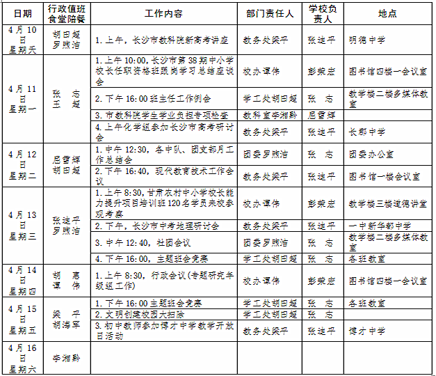 其他:青年教师教学技能大赛初赛(周一至周五);青年教师读书比赛活动;参与湖南省教育学会课题申报工作;我校省规划办课题《名校集团化办学:基础教育高位均衡发展的长沙模式》结题;高考、学考、中考考点监控系统建设申报;启动2016年政府采购项目申报材料准备;开展社团吉祥物征集活动;收集校园文化衫设计方案;校园电视台招新;开展“爱心帮扶”活动;督导工作:抽查教师的教案,学生的作业。