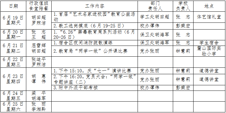 第18周:6月19-25日 来源:校办 发布时间:2016-06-20 22:01:54 浏览次数: 次 【字体:小 大】 聚彩彩票第18周工作安排表 (2016年6月19—6月25日) 其他:学生纪律教育;班主任会议。督导工作:巡查教师办公、督促教师指导学生期末复习,抽查期末学生上课、午休、课后活动纪律等。 校办公室 2016年6月20日 分享到: 【打印正文】