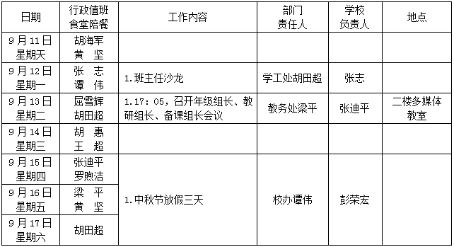 第3周:9月11-17日 来源:校办 发布时间:2016-09-12 08:56:01 浏览次数: 次 【字体:小 大】 聚彩彩票第3周工作安排表 (2016年9月11-17日) 其他:1.社团校本课程、兴趣课校本课程及艺术校本课程会议;2.省、市级规划课题开题准备;3.研究性学习课题申报;4.2016市教科院教育教学论文上交;5.遴选湖南省中小学教师队伍建设“双百工程”2016年度优秀参评作品;6.“星城杯”教师教学竞赛初赛报名准备;7.常规教学督查。 校办公室 2016年9月12日 分享到: 【打印正文】
