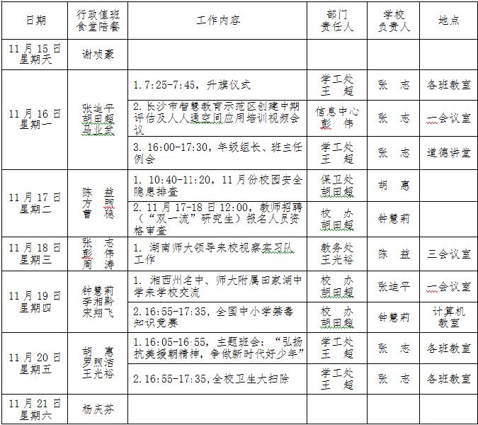 第12周工作安排:2020年11月15-21日 来源:校办 发布时间:2020-11-16 10:25:40 浏览次数: 次 【字体:小 大】 聚彩彩票2020-2021学年度第一学期 第12周工作安排表 (2020年11月15-21日) 未进入上表的其他工作:1.期中常规检查和测评通报;2.期中考试质量分析;3.高考报名工作;4.2020年度中学中、高级教师评审材料整理、上报;5.11月16-20日晚,参加附中排球赛。 校办公室 2020年11月15日 分享到: 【打印正文】