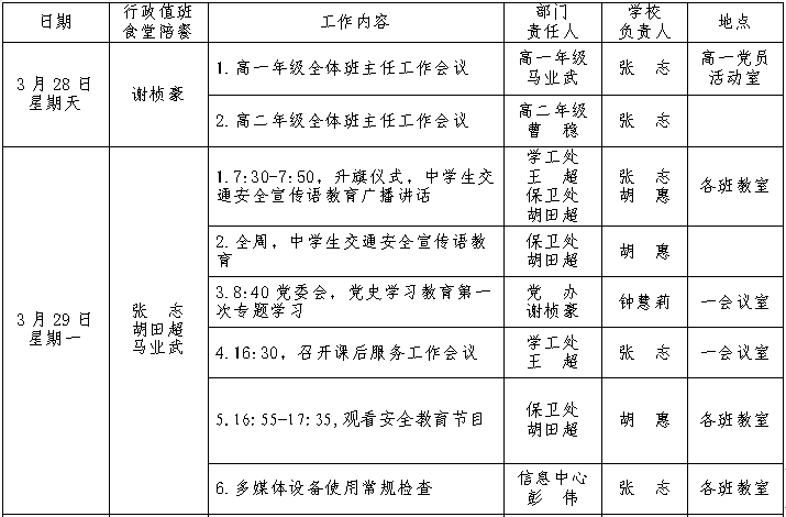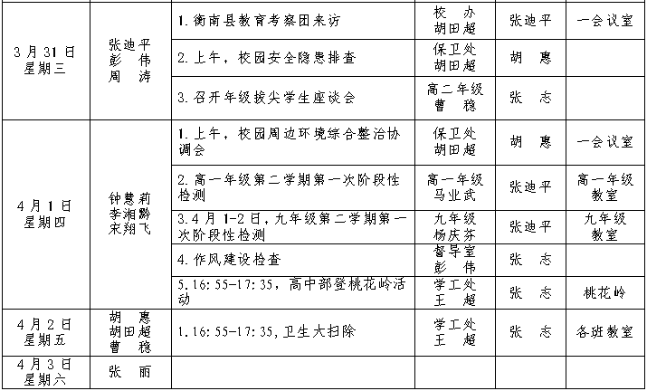 第5周工作安排:2021年3月28-4月3日 来源:校办 发布时间:2021-03-29 14:49:41 浏览次数: 次 【字体:小 大】 聚彩彩票2020-2021学年度第二学期 第5周工作安排表 (2021年3月28-4月3日) 校办公室 2021年3月28日 分享到: 【打印正文】