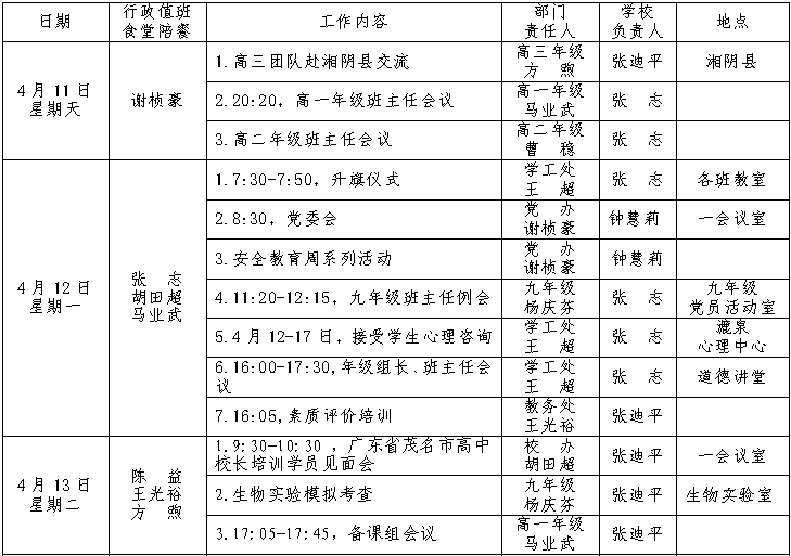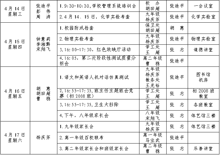 第8周工作安排:2021年4月11-17日 来源:校办 发布时间:2021-04-12 17:32:22 浏览次数: 次 【字体:小 大】 聚彩彩票2020-2021学年度第二学期 第8周工作安排表 (2021年4月11-17日) 校办公室 2021年4月12日 分享到: 【打印正文】