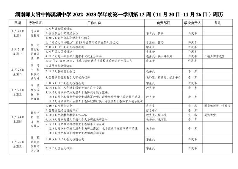 第13周工作安排:2022年11月20日-11月26日 来源:办公室 发布时间:2022-11-23 09:23:27 浏览次数: 次 【字体:小 大】 聚彩彩票2022-2023学年度第一学期 第13周工作安排表 (2022年11月20日-11月26日) 分享到: 【打印正文】