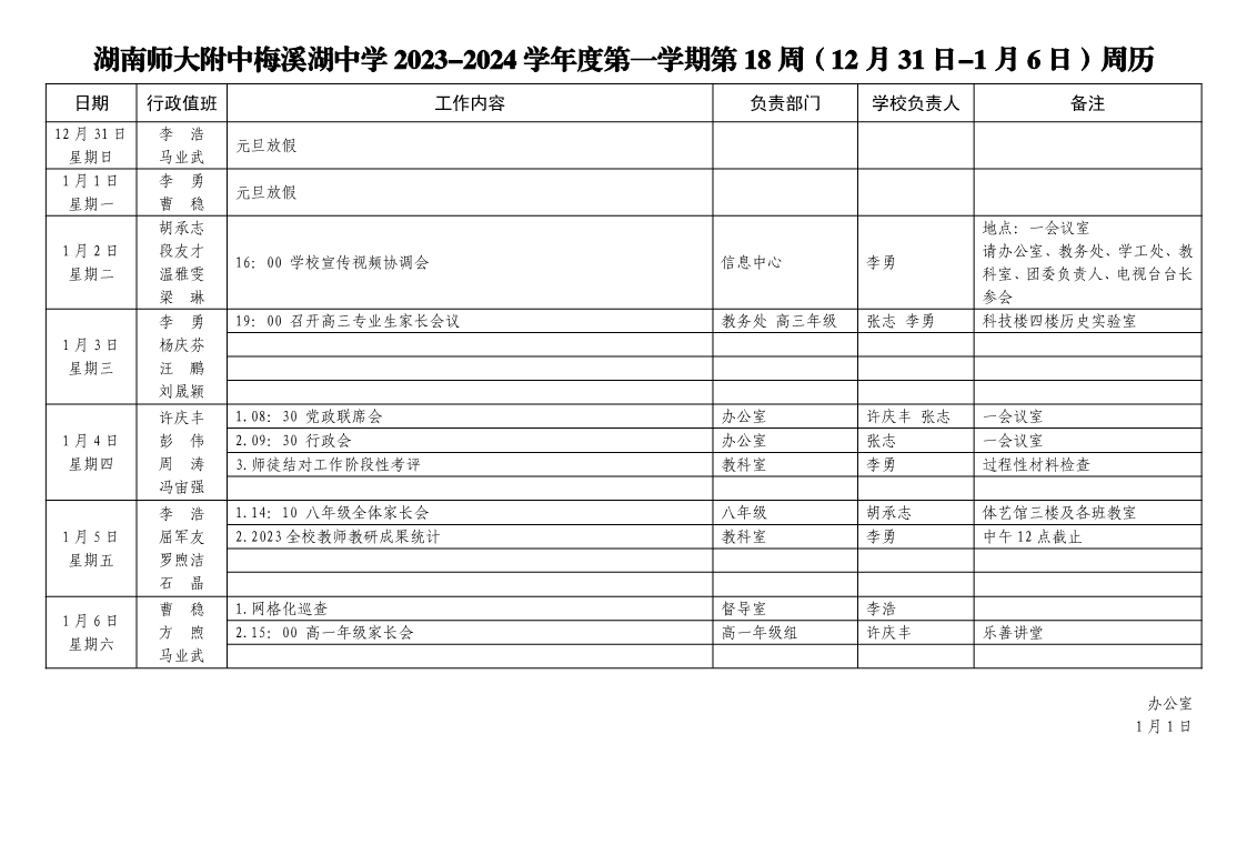 2023-2024学年度第一学期18周周历