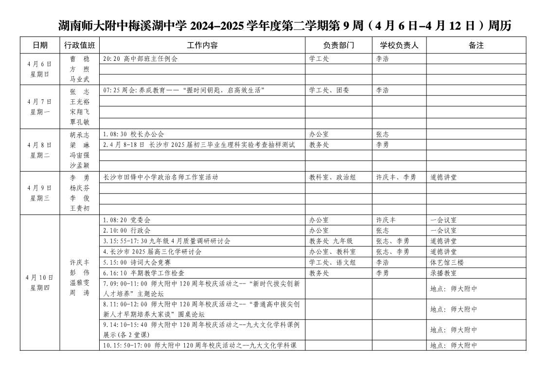 2024-2025学年度第二学期第9周周历