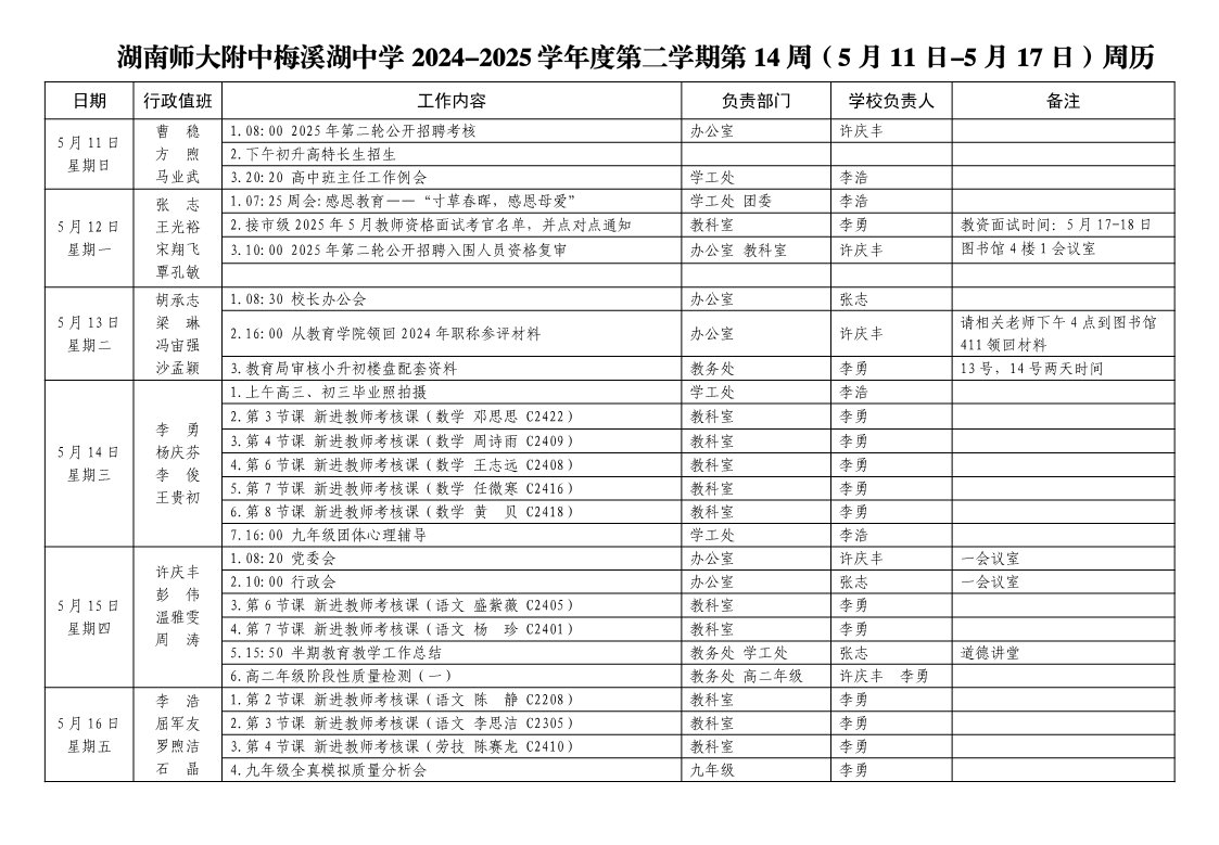 2024-2025学年度第二学期第14周周历