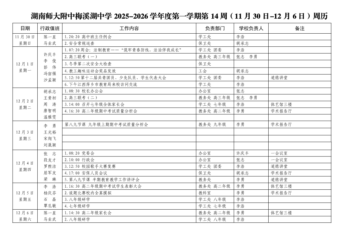 2025-2026学年度第一学期第14周周历